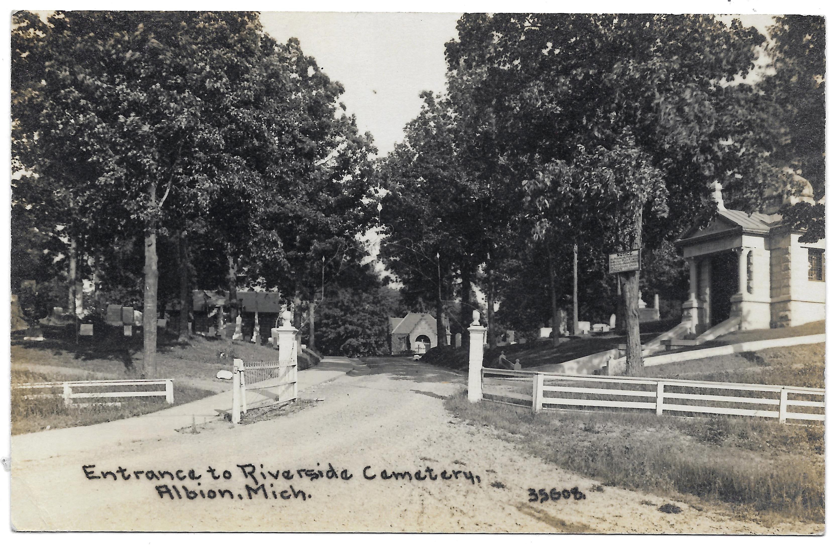 Morning Star, April 18, 2025 Recently there were metal gates installed to the two paved center entrances of Riverside Cemetery. The only two drives now open are the main entrance where the office is, and at the far unpaved south entrance by the gas company pumping station. If you want to go to the Veterans Memorial Stage or to the Catholic Section in back, you now have to use one of the aforementioned open entrances. Speak to your Albion city council person if you have an opinion about that. This is not the first time the Cemetery has been gated, however. A century ago, there used to be a wooden fence which lined Riverside Cemetery along what is today M-99. It was painted white and probably required much maintenance. It did look nice, however. I haven't found a date when it was removed, but it was probably around the Great Depression period. At the main entrance to the Cemetery leading to the office and the receiving vault were two decorative posts, with a globe on top of each, and a wire swinging gate attached to the north post. Above the posts was one of those decorative heavy wire overhead entrance arches, customary for cemeteries at the time. Many of our small rural cemeteries still have these, for example, the Wright Cemetery along M-99 east of Albion, and the Clarence Township Cemetery east of Duck Lake. From our Historical Notebook this week we present two 1910 postcards. The first shows the entrance to the cemetery, once filled with majestic trees complete with foliage. Notice the two entrance posts, and the open gate attached to the left post. On both sides is the beautiful fence with its top cap. On the right is a tree upon which a sign has been placed. That sign text states in capital letters: "NOTICE, ALL PERSONS ARE FORBIDDEN TO PLUCK FLOWERS OR DISTURB OR INJURE PROPERTY ON THESE GROUNDS, UNDER PENALTY." Our second photograph is a close-up of a similar view, but this one better shows the decorative overhead wire arch which used to adorn the entrance to our Cemetery. Unfortunately, the sign does not appear to state "RIVERSIDE" on it, unlike the custom at other cemeteries where such signs were installed. Our third photograph shows one of the new metal gates that were installed the last week of March. How many of our readers have visited Riverside Cemetery recently? ![]() 1910 postcard showing Riverside Cemetery Entrance with Fence