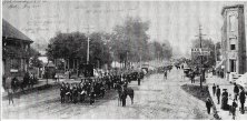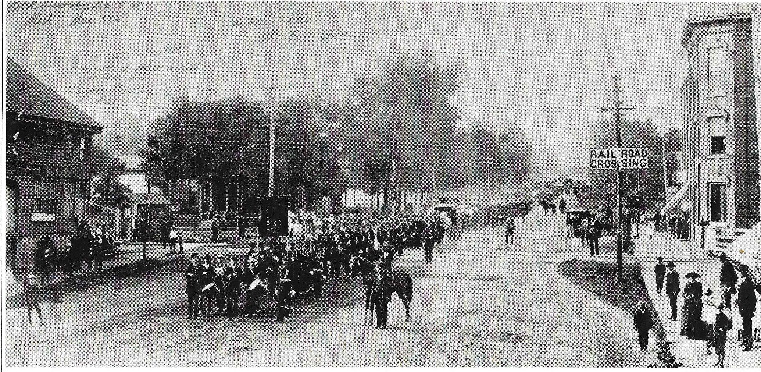 May 23, 2025, pg. 8 In a quirk of local history however, Decoration Day in Albion was not started by the G.A.R. The first Decoration Day here was held on May 30, 1882. It was conducted by the local Knights Templar Masonic Lodge, as the local G.A.R. post had not yet been formed (December, 1883). Albion Republican newspaper editor Benjamin Baxter Bissell wrote an historical account of this first parade/ceremony in Albion, which we are sharing with our readers this week in our Historical Notebook. Bissell wrote, "There was then no Grand Army post here, and it does not appear that the old soldiers had any part in it except in common with other citizens. The exercises of the day were under the direction of the Knights Templar, who were reinforced by a large accession from Marshall. The committee of arrangements was composed of Frederick W. Sheldon, Robert J. Frost, Augustus J. Gale, Charles W. Dalrymple, and F.A. Alsdorf. The procession did not form until 3 o'clock. It was headed by the band and Knights in full uniform, presenting a very attractive appearance. The Ancient Order of United Workmen, the fire department and several other organizations were also in the column, including as many of the veterans of the War as could be got together. The teachers and pupils of the schools marched on the sidewalks and made a lengthy procession of which the twenty little misses selected to scatter flowers upon the graves were complimented by one of the speakers as the flowers in full bloom. For the entire distance, to the cemetery, the sidewalks on both sides of the street were crowded with citizens, while the street was filled with carriages two and three abreast for a distance of a quarter of a mile. One thousand persons were counted as they passed a given point returning from the cemetery. The address was given by Dr. Lewis Ransom Fiske, president of Albion College, and a poem was read by Professor E.C. Thompson, superintendent of the city schools. The graves of 17 soldiers were decorated," wrote Bissell. From our Historical Notebook this week we present a photograph of the 1886 Decoration Day parade in Albion, then sponsored by the Albion Post No. 210 of the G.A.R. The view looks north on N. Superior St. from just south of the Michigan Central Railroad tracks. Notice there is no hill at the tracks as there is today. On the left is the Maher Planing Mill building, presently the site of the Hurley Block (Lopez Taco House). Across the tracks is the home of F.M. Manning (1817-1897), demolished in 1912 and site of today's Albion Post Office. On the right is the Hotel Albion, demolished in 1930 and today the site of the Shell Gas Station. Marching the center are Albion's Civil War veterans, holding the G.A.R. banner. Only a few are identified. The man on the horse is Dr. Frank Palmer, with the man standing in front being Frederick Pahl, Sr. In back standing on the tracks is Levi Warren. In the front row of marchers, beginning on the left, the man to the left of the snare drummer is Charles Kilmer, and the man with the fife between the drummers is Bradley Waterman. On the far-right end is Frank Glascoff, and two rows behind him is Oscar Hubbard with his hat off. Behind Hubbard with his hat off is Willard Durkee. Across the tracks on the right standing in front of the horse and buggy is Benjamin Cook. Today of course, Decoration Day is known as Memorial Day which is observed on the last Monday in May. This year the date is May 26. Make plans to attend Albion's Memorial Day parade at 10 am. on S. Superior St. to Riverside Cemetery, and the subsequent service at the Veteran's Memorial Stage. I hope the newly installed locked gates at the Cemetery by the Stage will be unlocked for this event. ![]() 1886 Decoration Day parade in Albion