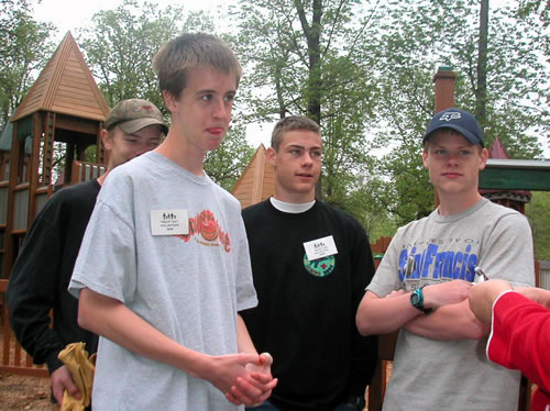 May 15, 2004Albion Community Initiative Help Day volunteers from Boy Scout Troop 172 were on hand for the picnic after working up an appetite volunteering. Here, Matt Claucherty, Charlie LaNoue, Nick Peltier and Alex Harden stand by ready for the next task. Previous | Home | Next |