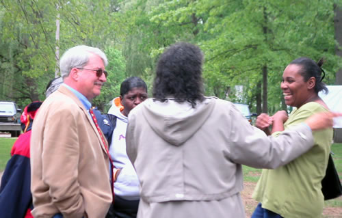 Pastor John Sterner visits with Albionites and shares the joy of the day.