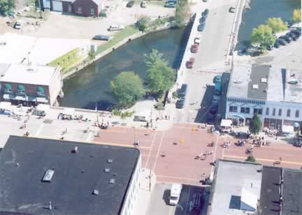 The corner of Cass Street (running vertically here) and Superior Street was the site of the Festival the Forks information booth. Notice Albion's brick main street. Over 1/4 mile of Superior Street has been brick paved for many years. The bricks were replaced not long ago. |