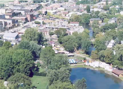 This is one of the first views we actually saw when we lifted off in the helicopter. We were in the big field at Victory Park, and when we went straight up, we overlooked the "skating pond" in Rieger Park. Just beyond that, you can see the carnival. The south branch of the Kalamazoo River can be seen above the pond. In the center, is Stoffer Plaza, where we have a farmer's market every Wednesday and Saturday morning, in season. On the left, is Superior Street (Albion's main street), where most of the Festival of the Forks takes place. |