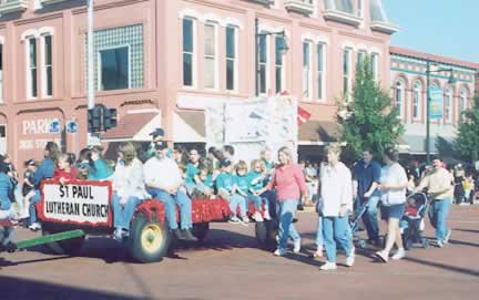 The parade opens with a float by St. Paul's Lutheran Church. In the background is Park's Drugs. We are standing at the corner of Erie Street and Superior Street. (you can see this corner in the aerial tour also.) The parade was a beautiful beginning to a beautiful day. |