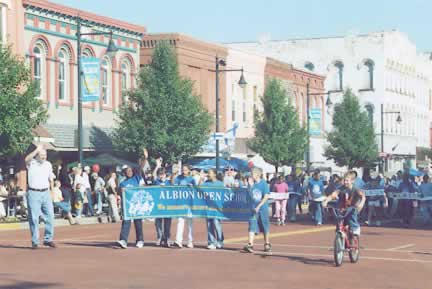 Albion Open School, marches along, with 6th grade teacher Mr. Petro at the left waving to his fans. Albion Open School is called that because students progress at their own pace. |