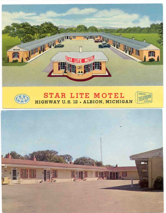 Morning Star, February 18, 2001, pg. 11 This year we’re going to see alot of road work along the I-94 Business Loop in Albion, much of it on the former U.S. 12 highway. This was once part of the main artery between Detroit and Chicago, and by the 1950s the two-lane road had become clogged with traffic. This year we plan on featuring some articles about our business route. If you’ve got old photographs of businesses on U.S.-12 and on N. Eaton St., let me know. I’m particularly looking for 1950s era photos to borrow. Numerous "Drive-In" restaurants, the predecessors of the fast food restaurants, sprang up during the 1950s. In the Albion area we had the "Tik-Tok" Drive-In on Austin Avenue, while on Jackson Road (that’s what Michigan Avenue east of town was once called) there was the A & W Restaurant Drive-In, Trippitt’s Drive-In, and the Star Light Drive-In. The latter was located at 1630 Jackson Road, and was operated by Alonzo B. Core in 1951. If the name Star Light sounds familiar, it should. The Drive-In there became the site of a modern 1950s-era "courtyard" type facility called the Star Lite Motel. It was a 16-unit, AAA-rated motel owned by Mike Nester[enko] (1910-1999), a native of Saratoff, Russia who grew up in Albion. Mike of course was a local entrepreneur who owned Nester Metal Products on Austin Avenue. The Star Lite Motel opened on Sunday, August 23, 1952, and was managed for several years by Harry and Thelma Gardner. The Star Lite was the first Motel in the Albion area to compete with the bulky and traditional Parker Inn Hotel a mile away. The Star Lite was designed for busy travelers who wanted to easily go "in and out," and get on their way. A guest would park their car outside directly in front of their room and enter from the outside. This was unlike traditional motels where you had to enter an inside lobby and walk through a hallway. Like the Drive-In restaurants, the Star Lite design concept was a prelude to the highway-access hotels we have today. There was also a little restaurant/cafe in the front center of the complex, designed to meet the needs of the hotel guests. Local people too would eat here. When Interstate-94 opened in July, 1960, there was a considerable reduction of traffic into Albion. The need for food and bedding lessened, and the Drive-Ins around Albion were closed, except the A & W which moved to N. Eaton St. from its original scenic "across from Brooks Foundry" site. Food, lodging, and fuel businesses flocked to N. Eaton St. near the I-94 interchange. The Star Lite Restaurant, too was closed, and the building demolished. The Motel was sold to Gerald Adams who operated during the 1970s. In the 1980s it was owned by Ralph B. Hock, and called the Sunshine Motor Lodge. In the early 1990s the Motel was closed, and converted into individual apartments as they remain today. From our Historical Notebook we present an artist’s 1950s tourist postcard of the Star Lite Motel, with the Cafe in the center. Notice the AAA emblem, and the box boasting "Preview Television in Rooms." In the background we see a beautiful landscape. If you look closely, yes, those are mountains in the distance! How many of our readers remember the Star Lite Motel?