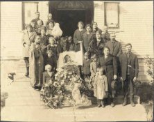 Morning Star, September 14, 2003, Pg. 9 You are invited to visit my Albion history booth at the Festival of the Forks in front of Citizen’s Bank this coming Saturday morning and early afternoon, September 20. I’ll have my Albion history books available, and will be accepting donations of Albion & Calhoun County history books, atlases, city directories, photographs, etc. We’ll see you there! A reminder that my articles from this column are also placed on the www.albionmich.com web site. Be sure and visit it and see what’s there! As we celebrate our ethnic diversity in this city, we are reminded that each culture brought with them from the “old country” certain customs and practices. Some practices were also adapted and Americanized. Because of inheritance laws back in the “old county,” it was often prudent to take a photograph of a funeral in order to prove that a person was really deceased. This would help speed up any inheritance transfers of land and belongings left behind with other family members. A photograph would also show the various family members and mourners who attended the funeral. It became customary to prop the deceased up in his casket, and be surrounded by the family and friends when the photograph was taken. Such was the case at the local Holy Ascension Orthodox Church on Austin Avenue. This church was organized in 1916 to serve the spiritual needs of the hundreds of persons who came to Albion from Eastern Europe, whose fathers were recruited to work at the Albion Malleable Iron Company. One such person was Alex Dmitruk (1887-1923). He was a native of the Galacia region of the Austrian Empire. He was married to Anna Egnatuk (1890-1969), whose mother Helen (Bleshinski) Egnatuk (1850-1946) was the matriarch of the Russian Community. Helen was employed by the Albion Malleable Company to serve as the liaison with the local Russian settlement and run the company housing. Alex worked at the Malleable and lived with his wife in company housing north of the plant at 24 Factory Place, now the site of McAuliffe Park. The Egnatuk family lived at 2 Factory Place, and later moved to 718 Austin Avenue. Alex was a founding member of the church and served on the first Parish Council. He and his wife Anna purchased a small meat market on the “West End” which they ran. They subsequently purchased a farm between Springport and Eaton Rapids where they lived, along M-99 just north of the junction with M-50 Unfortunately, Alex died there on the farm (“too much alcohol,” as a family history states) and was buried in Riverside Cemetery. His widow was left with several girls and one baby boy to support. Due to space limitations, we’ll end the family history story at this point. This week from our Historical Notebook we present an unusual photograph of a common practice in the early 20th century. It features the funeral party of Alex Dmitruk on October 5, 1923, posing on the front steps of the Holy Ascension Orthodox Church. In the center of course in the casket is Alex Dmitruk. On the left above, the woman holding the baby is his widow Anna (Egnatuk) Dmitruk (1890-1969) who later married John Marchuk. She is holding their infant Leo Dmitruk (b. 1922). Above her is Helen (Bleshinski) Egnatuk (1850-1946), the matriarch of the Russian community here. To the left of Helen by the window is her son Walter Egnatuk (1893-1952). Below is his brother Egnat Egnatuk (1895-1977) with his infant son Alex (1921-2001) to the right, and wife Anna (Slivoskey) Egnatuk (1904-1958) on the left. Below is the priest, Rev. J. Velma, followed on the right by the four Dmitruk girls in descending order top to bottom: Helen (1911-2002), Nadine; Alice; and Anita known as “Bobbie” who lives in Kentwood today. On the right half of the photograph beginning at the top above the casket, the child is unidentified. The first woman is Sophia Dubowik (1887-1944), wife of Grigori/George Dubowik. The second woman is “Tetcha” Egnatuk (1900-1981), the first wife of Walter. The third woman is unidentified. The woman in the fur coat below her is Mrs. Mary Olinyk (1897-1963). Below her are her two sons, Peter (1917-1980) with his head turned, then Walter who lives in Marshall today. The man to the upper right of Mary is unidentified. Next to Mary on the right is Jacob Thurovat (1877-1951). Below him is his wife Anna (1895-1962), and below her is their daughter Lydia (1920-2002). Standing on the far right is Paul Olinyk (1889-1953). Special thanks to those who helped with identifications for his week’s photograph, and to my 2nd cousin Phillip W. Collier (a direct Egnatuk/Dmitruk descendant) for supplying it. ![]() The funeral party of Alex Dmitruk on October 5, 1923