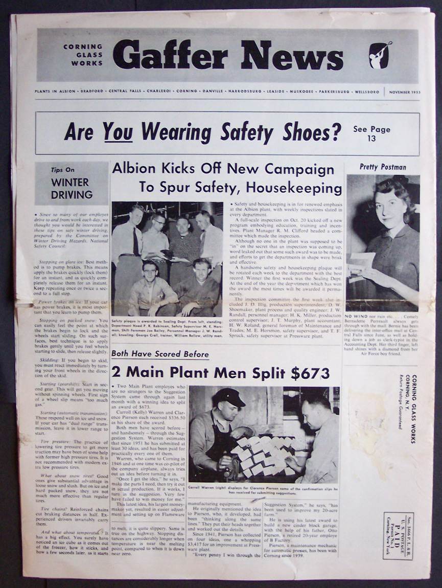 Morning Star, November 19, 2006, pg. 3 Albion’s major factories all once had “company papers,” which were magazines printed by these firms. Usually these magazines contained articles about company products, their customers, and safety issues. The majority of their pages, however, were filled with employee news. Major themes included sports such as bowling leagues and softball/baseball teams, fishing and hunting, employees sons or daughters high school graduations, years of company service awards, and retirements. We’ve previously covered in this column company magazines such as “The Gale News” published by the Gale Manufacturing Company; the Albion Malleable Iron Company “Circle-A-Tor;” “The Union Steel Messenger;” and “The Hub” produced by the Hayes Wheel Company. I’ve still yet to see my first copy of “The Brooks Foundry News,” begun in October, 1953. These magazines are excellent sources of local history, and I’m always looking for issues to add to my Albion history archives. This past week I spent time sorting through issues of the “Gaffer News.” Remember the Gaffer? What a name for a magazine! Actually, one of the dictionary definitions of a gaffer is the head glassblower. That name fit perfectly for employees of the Corning Glass Works, which operated here from the 1950s through most of the 1970s. The Gaffer was a nationally produced monthly magazine published by Corning, and featured news from all its plants around the U.S., including the Albion one. Very few employees here saved them, as I’ve seldom come across these. I do have, however a copy of the November, 1955 issue in front of me. In looking through its pages, I came across articles about the following: William Knickerbocker who was awarded $193 for the “suggestion box” ideas that saved the Company money; a photo of Albion Local 1006 Union officers taking a course in collective bargaining; a photo of the just-born Weller cousins (Stephen and Cheryl) with their parents; and a back-page article with photo concerning the Albion plant’s new safety and housekeeping campaign. The publishers page lists the following persons from Albion who were on the local magazine committee: J.B. Smith, Shurleigh Sherman, Victor Hoag, John Jasienski, Joyce Kopp, Fred Kraus, Maxine Weckman, Al Proteau, and Julyann Tyzsko. From our this week we present a photograph of the back page of the November, 1955 issue of The Gaffer. How many of our readers remember The Gaffer? ![]() The November, 1955 issue of The Gaffer All text copyright, 2025 © all rights reserved Frank Passic