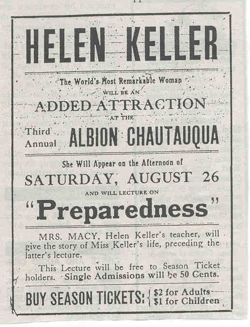 Morning Star, June 5, 1994, pg. 5. In the late 19th and early 20th centuries, the summer adult education movement "camp meeting" style known as Chautauqua was flourishing across America. It is estimated that as much as one-third of the U.S. population participated in some aspect in the Chautauqua movement in its heyday. Locally, Chautauqua was held on the lower campus of Albion College, (now the site of the Kresge Gymnasium) beginning in 1914. It brought in world-famous speakers and musicians to town each season. In 1916, Chautauqua was held here August 23,30, and the feature speaker was the famous blind, deaf, and dumb woman, Helen Keller (1880-1968). Keller had lost her sight and hearing at the age of 19 months as the result of a tragic brain fever. Unable to communicate with anyone, she often threw violent tantrums or laughed hysterically. Her parents took her to Alexander Graham Bell for help, who subsequently introduced Helen to her teacher, Anne Mansfield Sullivan (later Mrs. John A. Macy). Sullivan taught Helen Keller the names of objects by pressing the manual alphabet into her palms, and later Helen learned to speak by placing her fingers on Sullivan’s larynx to "hear" the vibrations. Helen subsequently graduated cum laude in 1904 from Radcliffe College in Cambridge, Mass. Helen Keller lectured throughout the country, and wrote several books. Her life was captured in the play, "The Miracle Worker" by William Gibson, which won the Pulitzer Prize in 1960. It was subsequently made into a motion picture in 1962. Helen Keller came to Albion twice during the 1910s [and also once in the late 1930s]. She first spoke here in the winter of 1913, when she related to the local audience the story of her life, with a supplementary address by Anne Sullivan Macy. She returned again on August 26, 1916 to a packed tent. Accompanied by her teacher Anne, and her secretary Peter Fagan, Helen Keller spoke in Albion on the topic of "Preparedness," as World War I raged across the ocean. Taking the position of "Peace and Brotherhood," Keller urged that the United States stay out of the war, stating "This is my country and I love it. I will not see a few excited shouters stampede it into war. War is the particular business of a few men. Some of the ablest press agents of the world are hired to promote preparedness. Peace is everybody’s business, and no one attends to it. If we are at peace; we owe it to one man, President Wilson." Keller’s speech was definitely more interesting than the other one given later in the day by one Dr. George Lamont Cole, and Albion College graduate who spoke that evening on the topic of "The Cliff Dwellers of New Mexico and Arizona." The event was well covered in the local newspapers. Three months later on November 20, 1916, a local paper carried the headlines "Helen Keller to Marry Secretary," referring to Peter Fagan, age 29, a former Boston newspaperman. Apparently they applied for a marriage license in Boston, and were to wed soon, according to the story. A setback for Keller was mentioned in the article, which we quote: "At present Miss Keller is suffering from a nervous breakdown, brought on by her lectures and writings. All her engagements have been cancelled, and she is going south to rest." Apparently Chautauqua and the isolationist "peace movement" during World War I took its toll on Miss Keller. From our Historical Notebook this week we present a photograph of Helen Keller, and an advertisement for her appearance in Albion. ![]() Helen Keller All text copyright, 2025 © all rights reserved Frank Passic