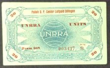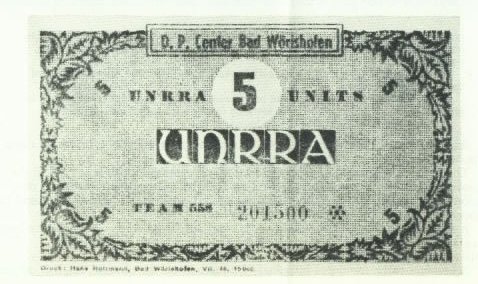 The Austrian division of the United Nations Relief and Rehabilitation Administration (the predecessor of the Internal Refugee Organization) issued money in 1-, 5-, 10- and 20 unit denominations for use in Austrian camps. Numismatic literature offers no other information about these notes.