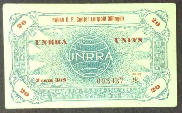 At present, a 20-unit note is known to exist, displaying a blue background with red overprinting. The note reads POLISH D.P. CENTER LUITPOLD DILLIGEN / 20 UNRRA UNITS / TEAM 308. On the reverse is a penalty clause written in Polish, which translates “Those who falsify the camp marks or those who use falsified currency will be punished.”