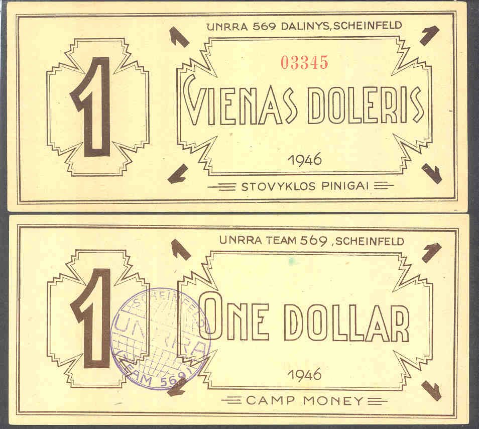 Until the establishment of the Scheinfeld camp in April 1946, its 1500 residents were interred at the DP camp in Regensburg. Apparently, Scheinfeld camp money was patterned after the money circulated at Regensburg, for a 1-dollar note in a private collection is identical to the Scheinfeld 1 doleris, except that the text on both sides is in English.
