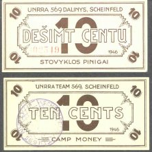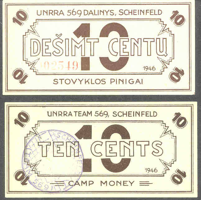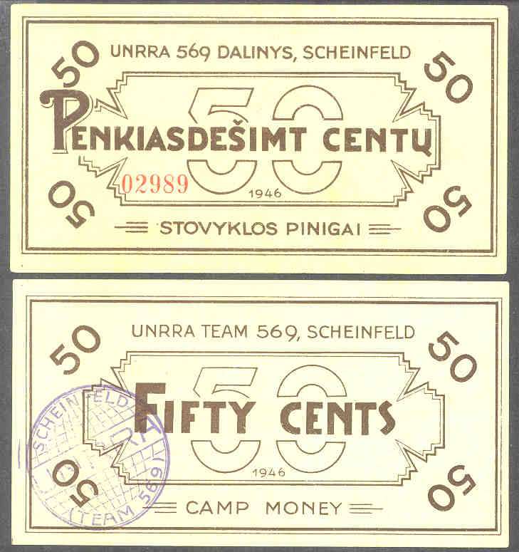 The DP issues of Scheinfeld, Team 569, are perhaps the most familiar of the Lithuanian camp money. Originally unknown in numismatic circles, the money suddenly appeared on the market in the early 1970s, when a small hoard surfaced in England. Because the specimens were in Uncirculated condition, many doubted if the money was actually put to use. Furthermore, interviews with former DPs reveal that German and military monies circulated within the camp, no one remembered ever seeing camp money.