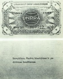 The Lithuanian encampment in Ludwig was part of the Dillingen UNRRA district, Team 308. Money used in this camp consisted of two issues; the first was printed on white paper, the second on light-violet paper. Initially, the notes were used to pay day laborers, but eventually all the camp’s inhabitants received payment in this form, with men receiving white notes and women receiving violet notes!