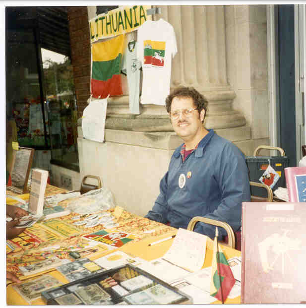 Frank Passic operates the Lithuania booth at the 1994 Festival of the Forks in downtown Albion. The "new" booth on the street attracted much attention, and soon people of Lithuanian heritage were coming up and letting the rest of us know who they were. Many purchased bumper stickers, flags, and buttons. Through the years, the Lithuania booth at the Festival of the Forks has become a regular part of the celebration which people look forward to. It is interesting to meet Lithuanians from neighboring communities who attend the Festival, and who make it a point to come to Albion to cast their "vote" for national heritage pride. Riverside Cemetery in Albion is the final resting place of many of the Lithuanian-Americans who lived in Albion. On August 29, 1996, the Michigan Historical Commission listed Riverside Cemetery in the State Register of Historic Sites. A special State of Michigan Historic Site marker was erected and dedicated on May, 1997. In the text of the marker, the country of "Lithuania" is specifically mentioned. This marker is placed at the entrance to the cemetery along M-99 on S. Superior St. The specific aforementioned text states in part, "A private Catholic cemetery contains the remains of people from Italy, Lithuania and Poland."
