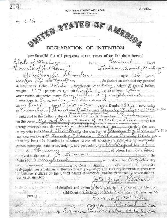 Alex Tautkus. Alex Tautkus (1916-1995) is shown here in uniform during World War II. He came to Albion from Cicero, Illinois. His parents were from Zagare, Lithuania. The 1920 census shows that John Stanley Skridulis (1903-1967), was living with the Baskevich family. He also was a native of Zagare, Lithuania. According to his 1939-40 naturalization papers, he had come to the U.S. in 1907. John moved to Chicago in the 1920s, where he married in 1930. He moved back to Albion in November 1933 and worked as a molder at the Malleable before moving back to Chicago again in 1940. The family then moved to northern Michigan (Ludington) where his wife Ella was from. He died in 1967, and had five children: 2 boys and 3 girls. My own maternal grandparents, Nikodimas (1890-1975) and Theodora (1893-1973) (Barvydas) Kulikauskas immigrated to Chicago in 1911 and 1912, respectively. Their parents were Joseph and Julianna (Vazgirda/Vosgird) Kulikauskas; and Ignatis and Barbora (Kondratas) Barvydas. Both my maternal grandparents spoke the Samogitian dialect of the Lithuanian language. My grandfather's ancestors had been Lithuanian "bajorai" (landowners) in the 18th & 19th centuries, and the name was originally spelled Kulakauskas. Beginning in the mid-1890s, the priests started spelling the family surname Kulikauskas on baptism and other documents. My grandfather's ancestors had owned land in Silale County in the 18th and 19th centuries. My grandfather's grandfather Petras-Povilas Kulakauskas (1814-1891) moved northwards towards Lake Lukstas just south of Varniai in Telsiai County, and my grandfather was born in nearby Nevardenai.
