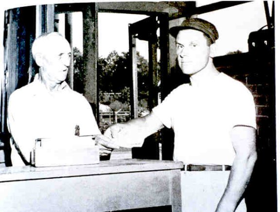 Vincas Simaskevicius. Vincas Simaskevicius (1920-1992) (right) receives his paycheck from guard Charlie Kopp at the Albion Malleable Iron Company (August 1955 Circle-A-Tor). Vincas was pictured several times in the Albion Malleable company paper, the Circle-A-Tor. Illustrated here is a picture from the August 1955 issue showing him in an activity which was looked forward to by Lithuanians: receiving a paycheck. Vytautas "Shorty" Kniburys (1919- ) is a native of Kazliai, Lithuania. He served in the Lithuanian army at the time of the Soviet invasion in 1940. He eventually was placed in the Dachau concentration camp by the Germans during the war. He was able to make it to the West following the war, and spent six years in Ravensburg, Germany. There he married his wife Rosa. The couple had two children, Frank and Rita, and the family came to the U.S. in 1951. The family moved to Springport (10 miles northeast of Albion) in 1952 where Vytautas worked for a few years. In 1956 he was hired to work at the Albion Malleable, where he worked for 30 years and retired in 1986. He and his wife Rosa live in retirement in Albion today.