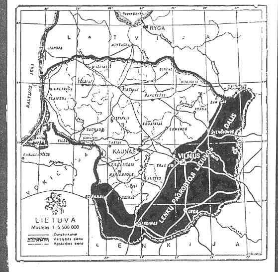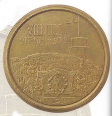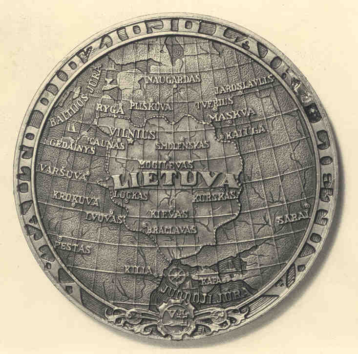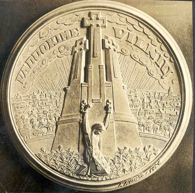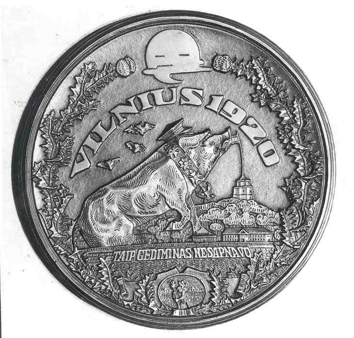Known Mintage: Only 12 specimens are estimated to have been struck, all 100 millimeters in diameter. Obverse: Entitled UNIJOS NORI (Union Desired), this extremely grotesque theme represents a naked and prostitute Poland offering herself forcibly to a fleeing Lithuanian male in national costume. Rimsa’s signature and the date 1925 are located at the two o’clock position. This same scene was also circulated on postcards produced by Rimsa. Reverse: Depicted is the Union rejected, with Poland exterminating all that is Lithuanian in Vilnuis. In 1925, the Polish occupational regime began an assault on Lithuanian school children for their outspoken nationalism. As a protest, Rimsa graphically portrayed the same deranged Polish figure devouring innocent Lithuanian school children in front of the famous Cathedral of Vilnius. The children are shown fleeing from the Polish terror. The legend reads NUO MARO BADO UGINIES IR NUO LENKU UNIJOS ISGELBEK MUS VIESPATIE, which translates “from pestilence, famine, fire and union with Poland, Deliver us O Lord!” ![]() Lithuania occupied by Poland 1920-1939.