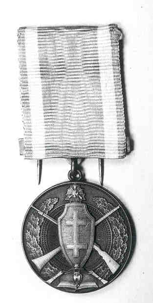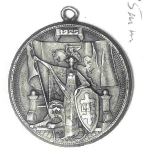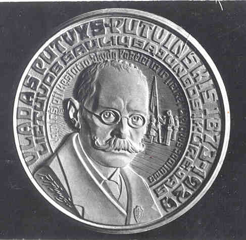Obverse: In the center of the medal are the images of Pope Innocent IV (left) and Pope Pius XI (right) who founded respectively, the first Bishopric and the first Metropolitan See in Lithuania. In the background is the Bascilica of St. Peter in Rome, and at the top of the personal insignia of Pope Pius XI. Reverse: Featured is the image of Bishop Kristijonas (Christian) (left), the first Lithuanian bishop, who received his appointment from Pope Innocent IV on July 17, 1251. Prior to his appointment Kristijonas was a priest of the Teutonic Order under the German archbishop of Riga. Kristijonas established his See in the pagan Samogition region of Lithuania, but only remained until 1259 when he left for Germany and ended his days in 1270 as a suffragan bishop of Mainz. On the right is the image of Archbishop Juozapas Skvireckas (1873-1959), the first Archbishop of Lithuania. Skvireckas was a well-known scholar and the theologian who translated the Bible into the Lithuanian language. He governed the Kaunas archdiocese for almost the entire period of Lithuanian independence. He fled Soviet-occupied Lithuania in 1944 and went to a convent in the Austrian Alps, where he lived until his death. The arms of Bishop Juozapas disappear at the top of the medal. The inscription reads, IS PRIESU RANKU ISSILIUSAVE DRASIAU TARNAUSIME JAM, which translates “having liberated ourselves from the enemy’s hands, we shall serve with more courage.” The names of the two men appear around the perimeter of the medal. 9. In Honor of Vladas Putvys-PutvinskisThis medal was issued in honor of the founder of the Lithuanian National Guard (Lietuvos Sauliu Sajunga), Vladas Gerardas Putvinskis-Putvys (1873-1959). Putvys was descended from an old Lithuanian noble family, and his estates became important centers for secret Lithuanian activities in the late 19th century. He founded the National Guard in 1919 and was elected its first president and commander-in-chief.