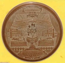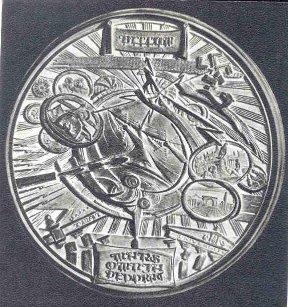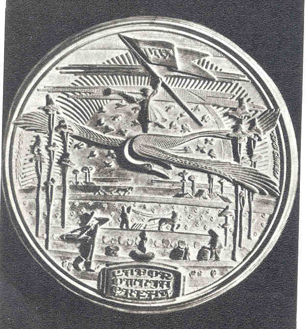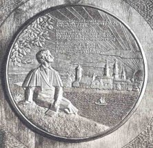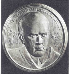 Obverse: Shown is Donelaitis holding a quill pen, with a library shelf behind him. The inscription reads KRISTIJONAS DONELAITIS 1714-1780. The date 1955 appears at the bottom. Reverse: Depicted is a manuscript of Doneliatis’ most famous work, The Seasons. Consisting of four parts, the medal shows the joys of spring, summer toils, autumn wealth and winter cares. Rimsa features the various seasonal peasant activities aside the manuscript. The poem reveals the class structure that existed during the 18th century. 18. Self PortraitA most unusual work and Rimsa’s last medal, this piece was created in the last decade of the sculpture’s life. The obverse was begun in 1950, as Rimsa approaches his 70th birthday. The reverse was completed in 1959. Plaster models, 61 millimeters in diameter, are known to exist, plus one large bronze personal edition. Obverse: The aged sculptor is shown facing forward. The legend reads KUREJA PAZINSITE NE IS VEIDO O IS JO KURYBOS, which translates “the creator will be recognized not by his face, but by his works.” Two versions of the obverse are known. One depicts the artist wearing his favorite wide-brimmed hat, obtained in London in 1924. The other version features a bald-headed portrait of the sculptor.