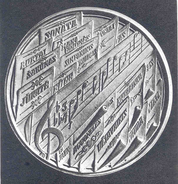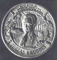 Obverse: Entitled BELLUM (war), this medal shows an intense conflict. The loops of Rimsa’s design contain scenes from major European cities. Bayonets point upward, and a broken swastika appears at the one o’clock position under which is a dead German eagle. In the center a ghost emerges, symbolizing man, the initiator of wars. The lower cartouche bears the inscription MARS OMNIA DEVORAT, which translates “war destroys everything.” Reverse: Entitled PAX (peace), the dove of peace appears, observing the nation at work in harmony, with a girl trumpeting the victory flag above. Rays of the sun shine brightly in the background. The bottom inscription reads LABOR OMNIA CREAT, which means “labor creates everything.” 13. In Honor of Juozas GruodisThis medal was struck in bronze in 1945, is a 23.5 millimeters in diameter, and honors the then-living Lithuanian composer, Juozas Groudis. Born in Rakenai on December 20, 1884, Gruodis studies musical composition in Moscow from 1914 to 1916, and in Leipzig from 1920 to 1924. Upon his return from Germany, he became director and professor of composition at the Kaunas School of Music until his death in 1948.