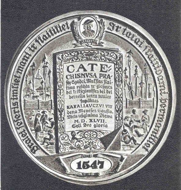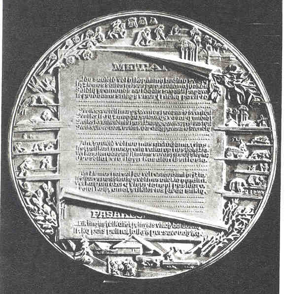 Obverse: Featured is the image of Gruodis, with musical and operatic symbols in the background. Included above Gruodis’ left shoulder is Rimsa’s “Wise Owl” emblem. The legend reads OPERA INGENIUM DEMONSTRANT, which translates “his work show ingenuity.” Rimsa’s signature appears in the upper left with the date 1945 opposite. JUOZAS GRUODIS appears under the bust. Reverse: Shown are several titled score sheets of Gruodis’ works. 14. First book in the Lithuanian LanguageStruck in bronze, this 35-millimeter medal commemorates the 400th anniversary of the first Lithuanian language book. The design reflects the communist ideology of post-World War II Lithuania, yet shows Rimsa’s determination for artistic freedom.
