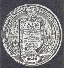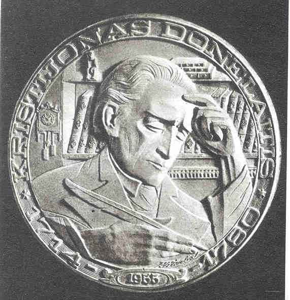 Obverse: Struck in bronze, this 28-millimeger medal depicts a male and female in native garb with the Lithuanian flag raised, and symbols of industry, architecture, music and art in the background. The title states MES UZ TAIKA, which translates “we are for peace.” In a small oval at the bottom is the phrase I SVIRSA ATEITI, meaning “into a bright future.” In the top circle appears the communist hammer and sickle emblem. The legend reads LIETUVOS TARYBU SOCIALISTINE RESPUBLIKA, which translates “Lithuanian Soviet Socialistic Republic.” Reverse: Shown is a glorified map of post-World War II Lithuania, containing the names of the country’s major cities: Klaipeda, Siauliai, Panevezys, Kaunas and Vilnius. Because of the suspicious-looking nature of the map, whose boundaries bulge outward too far in places, the reverse of this medal was never pictured in leaflets or books about Rimsa printed in occupied Lithuania. The date 1949 appears at the bottom. The obverse legend is repeated on this side. 17. Kristijonas DonelaitisStruck in bronze, this 36-millimeter medal honors the 175th anniversary of the death of the classical poet. Kristijonas Donelaitis, the first Lithuanian poet to be translated and recognized in histories of European literature. Born January 1, 1714, in Lazdyneliai, Donelaitis studied at the University of Koenigsbert. He was appointed pastor in Tolminkiemis, and in his spare time composed verses in Lithuanian. His most famous work, The Seasons, followed the literacy tendency of the day by portraying the natural setting of the village and its inhabitants rather than cities and/or aristocrats. Donelaitis died on February 18, 1780, in Tolminkiemis, which is now 15 kilometers southwest of the present Lithuanian border. After World War II, the Russians changed the name of the town to Chystye Prudy, and destroyed Donelaitis’ church. Under its ruins were found Donelaitis’ remains. Based upon skull structure, the appearance of the poet has been reconstructed, as Rimsa’s rendering depicts.