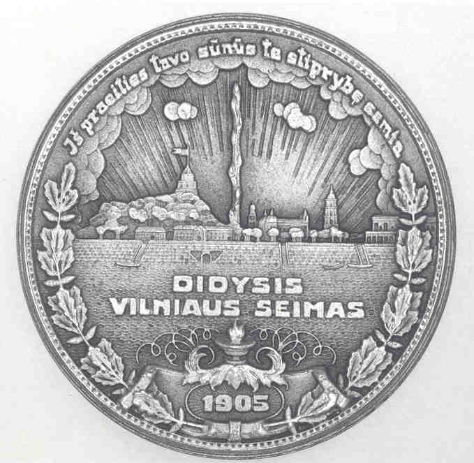 Obverse: Shown is a Lithuanian of the Klaipeda district (right) calling to arms a volunteer of independent Lithuania (left). The center depicts the defender of Lithuania receiving a sword from a patriotic woman, with the city in the background. Surrounding this is the inscription, KAS MUSU KOVA IGYSIM, which translates “that which is ours we shall fight to retain.” In the left oval is the Vytis emblem, opposite is the coat-of-arms of the city. The bottom contain a sword pointed upward, with the words, I-9 KLAIPEDA 1923, referring to January 9, 1923, when the call for help went out. A wreath of oak leaves surrounds the design, and the emblem of the Lithuanian National Guard, the double-barred cross, appears above. Reverse: Shown is Klaipeda after reunification. Major Lithuania (left) joins hands with Minor Lithuania (right), representing unity of the land and waters of Lithuania. In the center, the defender has returned, and is being bestowed with the laurel wreath of victory and honor. At the bottom is a downward pointed sword with the inscription 1-19 KLAIPEDA 1923, signifying the day of the insurrection. Below are twigs from the Lithuanian national flower, the ruta (rue). In the let oval is a sailboat, symbolic of the recreation of the area; opposite is placed a rake and a plow, symbolic of the industry and agriculture of the area. At the top of the medal is the Order of the Cross of Vytis, Lithuania’s highest military order for honorable service at that time. The legend reads ISKOVOTA-MYLET MOKESIM, which means “That which we have regained, we will know how to cherish.” Rimsa later issued another version of the medal with the inscription AMZIUS BUDEJE LAISVE LAIMEJOM, which translates “having waited for ages, we won freedom.” Specimens with the alternate inscription also bear the date 1-20 on the bottom, signifying the day victory was achieved. The obverse of the later version bears the inscription VADOUKIS PATS, IR BUSI LAISVAS. which means “save yourself and you will be free.” 3. Congress of VilniusFollowing the Revolt of 1905 in the Russian Empire, Lithuanian nationalists, concerned with the question of autonomy for Lithuania, gathered in Vilnius on November 21-22, 1905. Headed by Jonas Basanavicius, the 2000 member assembly resolved that the Czar was the enemy of Lithuania, that Lithuania should be autonomous, that Russian influences in Lithuania must be removed and that the Lithuanian language and culture should reign supreme in the country. Within a few weeks after the assembly dispersed, Lithuanians held elections, ousting Russian officials. However, the Russian government soon enacted repressive measures against those who had been active in carrying out the resolutions. This medal commemorates the 20th anniversary of the Congress of Vilnius.