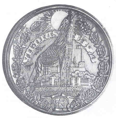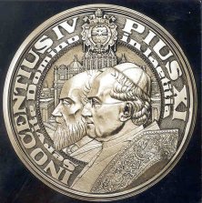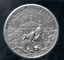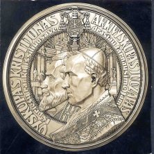 Obverse: Vytis is shown in violent combat, spearing the Polish dragon, with the (?) of Gediminas in the background. The top inscription is separated from the Columns of Gediminas emblem, and reads UZ RYTOJU – UZ TEVU KAPUS! which translates “for the future – for the graves of our ancestors!” Reverse: Portrayed is the monument Three Crosses, which stood on the high Bare Mountain on the steep right bank of the Vilnia River. This monument was erected in the early 17th century and remained a permanent feature of the cityscape until 1869, when it was destroyed. After World War I, artist Anton Wiwulski designed a new monument that was painted in white. This monument was blown up by the communists in 1950. The legend VADUOKIME VILNIU, which translates “let us liberate Vilnius,” appears at the top, with Vilnius in the background. Below is maiden Lithuania, who is chained to the monument amidst a bed of ruta, a symbol of virginity. She is awaiting Vytis to save her from Poland. At the five o’clock position appears Rimsa’s signature and the date 1926. 8. First Ecclesiastical Province of LithuaniaDuring the era of the Republic of Lithuania, not all the Lithuanian-inhabited areas included because of the large areas occupied by Poland. Roman Catholic Lithuanians sought to prevent the Holy See in Rome from recognizing Polish military conquests, but were unsuccessful. The archdiocese of Vilnius was transferred to Poland, and the Poles forced Lithuanian Bishop Jurgis Matulaitis to resign. In order to appease the Lithuanian church, Pope Pius XI raised Matulaitis to the office of titular archbishop and named him apostolic visitation to Lithuania, with the Metropolitan See located in the temporary capital of Kaunas. The ecclesiastical province of Lithuania received an official blessing from Pope Pius XI on April 26, 1926. Rimsa’s medal was issued in commemoration of the first ecclesiastical province of Lithuania. Lithuania first became a Christian nation in 1251 when Lithuania’s Mindaugas entered into relations with the Holy See, and Pope Innocent IV established the diocese of Lithuania. In 1252 Mindaugas was crowned King of Lithuania, in the name of Pope Innocent IV, who declared him to be a “special son of the Holy Roman Church.”