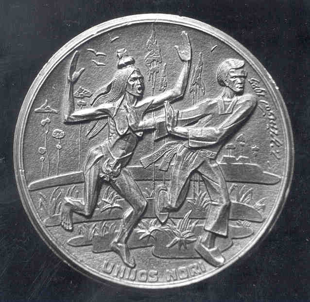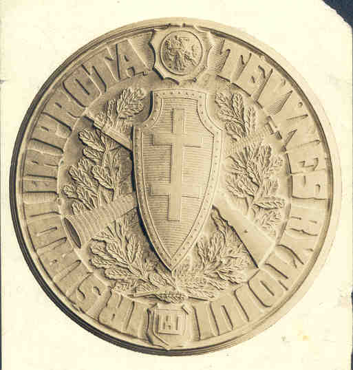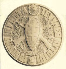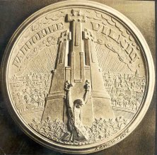 Known Mintage: No subscribers to this medal are known. Rimsa states in his recollection that only a dozen or so were minted, all 100 millimeters in diameter. One specimen is on display in the Rackus collection in the Balzekas Museum in Chicago. Obverse: The design focuses on the Lithuanian “Iron Wolf” (Gelezinis Vilkas), the legendary animal associated with the founding of the capital city. A close examination of the obverse reveals intricate details of the animal typical of Rimsa’s styling. The lines on the medal all come to a point on the animal’s right front leg where a dot signifies the center of the medal. According to tradition, Grand Duke Gediminas was hunting one day in the forests of Lithuania, and in a dream saw an iron wolf standing on a hillside howling as though it were possessed of a hundred wolves within itself. Upon awakening, Gediminas told of his dream to the pagan high priest Lizdeika, who interpreted the dream as follows: The hill is on the spot on which a large city will be built. The wolf signifies that the glory of this city will be heard throughout the world. The interpretation of this dream pleased Gediminas, and he built his castle on that hill, establishing the city of Vilnius. The background of this medal features the immense castle of Gediminas. To the right of the wolf as part of the complex is the Hill of Gediminas. The scene depicted here is a reflection of Vilnius in all of its glory. Three birds soar majestically to the left of the wolf. A shining sun signifies the rising Lithuanian nation. The top inscription reads VILNIUS 1323. At the base of the castle are the words TAIP GEDIMINAS SAPNAVO in stylized lettering, meaning “this was Gediminas’ dream.” Surrounding the sides is an oak / acorn wreath, a symbol of strength and endurance. At the bottom is the Lithuanian national emblem Vytis, with rays protruding outward, and at the ten o’clock position appears the signature of Rimsa. Fine-textured dots appear in the background. Reverse: In contrast with the obverse, the scene depicts Vilnius in 1920 after it was seized by Poland. At the base of the castle ruins is inscribed TAIP GEDIMINAS NESAPNAVO, which means “this was not Gediminas’s dream.” The center is dominated by a large pig furiously devouring the Lithuanian flag. The collar of the pig is adorned with Polish military symbols. The pig is wearing a military-style hat, representing the treasuring violation and method used to seize the city. To the left, instead of three birds, hover three bats, signifying the evilness of the pig’s presence. The legend reads VILNIUS 1920. The sun has been replaced by a dark moon, and the design is surrounded by a wreath of thistles and thorns. At the bottom is the coat-of-arms of Vilnius. 5. Unity and WarThis Unity and War (Unija ir Kova) medal resurrects the national conflict between the Lithuanians and Poles that has existed for centuries.