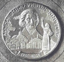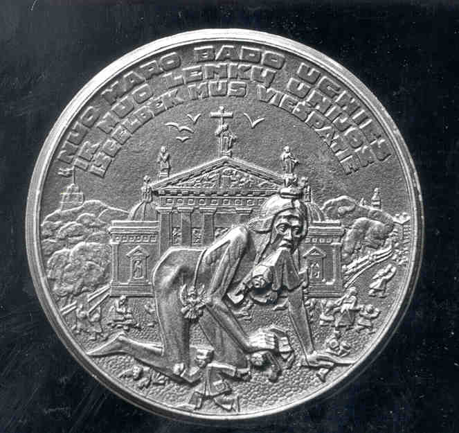 Obverse: The design depicts the first Lithuanian language book: a Protestant catechism by Lutheran priest and author Martynas Mazyvdas. Apparently the communists permitted Rimsa to reproduce the catechism on his medal for historic documentation and overlooked the religious implications. In the center is the title page of the book, CATECHISMUSA PRASTY SZADEI. This book was originally printed by the Hans Weinreich Press in Koenigsbert, East Prussia (Lithuania Minor), in 1547. The appearance of the book was closely associated with the reform movement. Mazvydas was a well-educated man, and a student at the University of Koenisberg. He encouraged Lithuanians to read and write in their own language. A small bust of Mazvydas appears at the top of the medal. A Lutheran pastor in Ragaine (German: Ragnit, Russian: Neman), Mazvydas was raised to the rank of archdeacon in 1554. He died in 1563. In the background are Lithuanians sitting near a fenced area. The date 1546 appears at the bottom. The Gothic inscription is taken from the first page of the introduction of the catechism, which has become known as the first Lithuanian poem. The famous lines read BRALEI SESERIS IMKIET MANI IR SKAITKIET IR TATAI SKAITIDAMI PERMANIKIET. In modern Lithuanian this reads Broliai, seservys, imkit mane ir skaitykit, which translates “brothers, sisters, take me and read.” Reverse: With the University of Vilnius in the background (old observatory building), a professor is shown teaching on a podium with a book below. He is raising his right hand, surrounded by gigantic books, all with corresponding symbols. Represented (left to right) are law, astronomy, architecture, medicine, and technology. Noticeably absent is religion. Displaying the communist hammer and sickle emblem, the podium’s legend reads KURIAME KULTURA TAUTINE FORMA SOCIALISTINE TURINU, which translates “we are creating our country according to the socialistic system.” At the bottom appears the date 1947. Rimsa’s signature appears on the right. The inscription is most unusual, considering the communist occupation, for it reads from the third verse of the Lithuanian national anthem: TEGU SAULE LIETUVOS TAMSUMUS PRASALINA IR SVIESA IR TIESA MUS ZINGSNIUS TELYDI, which means “may the sun of Lithuania banish all darkness, may light and truth guide our steps.” 15. Adomas Mickevicius-Rimvydas