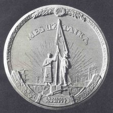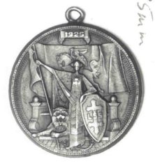 Obverse: The design focuses on the outline of the city of Vilnius, with the Hill of Gediminas in the background. The inscription reads, DIDYSIS VILNIAUS SEIMAS, which means “the great Congress of Vilnius.” At the top is a phrase from the Lithuanian national anthem: IS PRAEITIES TAVE SUNUS TE STUORTBE SEMIA, which translates “may your sons draw strength from the past.” Reverse: At the top is the date 1925. Depicted is independent Lithuania standing before her throne, holding the national emblem Vytis. The chain of slavery is at her feet, and the lion at her side represents strength. Her left arm rests upon the shield with the double-barred cross, the emblem of the Lithuanian National Guard (Lietuvos Sauliu Sajunga), and bears its initials, L.S.S. 4. Vilnius 1323/1920The first of several anti-Polish medals issued in protest of the Polish occupation of Vilnius.