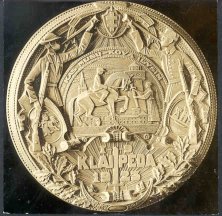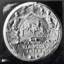 Known Mintages: 35 centimeter medal, private issue, only a few struck; 75-millimeter medal—300 struck; 20 100mm personal specimens cast in bronze. Obverse: Featured is Grand Duke Gediminas, dressed in chain mail and holding a downward pointing sword in his right hand. On his left shoulder is a decorative mask of a lion’s head, symbolic of Gediminas reputation as the “Lithuanian Lion.” Gediminas began the dynasty of Lithuanian rules that lasted almost 300 years. Ruling from 1316 to 1341, Gediminas completed the unification of the Lithuanian tribes and expanded the territory of the nation. The inscription reads GEDIMINAS DIDYSIS LIETUVOS KUNIGAIKSTIS MCCCXVI-MCCCXLI, which translates “Gediminas the Great, Grand Duke of Lithuania 1316-1341.” Reverse: Shown is Gediminas castle, the ruins of which are still found in Vilnius today. The inscription reads VILNIUS LIETUVOS SOSTINE, meaning “Vilnius, Capital of Lithuania.” At the bottom is Vytis (the knight), Lithuania’s national emblem, and the anniversary dates, MCCCXXIII-MCMXXIII (1323-1923). 2. Regaining KlaipedaIn 1252 the Livonian Order invaded western Lithuania, reached the Courish Lagoon and erected a stronghold on the site of a native Lithuanian village. Pope Innocent IV noted in 1253 that the stronghold had clearly been built in Lithuanian territory. Renamed “Memelburg”, the city was a source of boundary conflicts between Lithuania and the Teutonic knights and other warring factions for many centuries. After World War I, the Klaipeda region was placed under Allied control and Lithuanians feared the city would be returned to the Germans or taken over by Poland. In January 1923, the Lithuanians staged an insurrection and successfully regained the city. Known Mintages: 10,000 specimens were struck in 1927, some 60 millimeters in diameter and the remainder 35 millimeters. In addition, two personal editions were issued.
