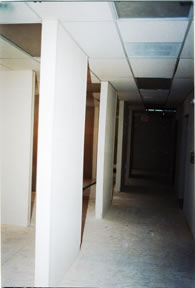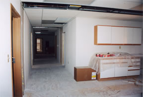 The large room we just saw is on the right, and now we are looking down the hall, to the first corridor. You can see some cabinets and things along the wall that are already installed.
