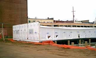 Here, a shot from the other angle. Three of the units are installed, and there are still wheels under each unit which will be removed when everything is secure. We have heard that the city inspector went down to Indiana, where the units were built, and measured each unit before they were trucked up to Albion. Each unit was allowed to have 1/4" of leeway in width, for an overall give of 2" allowance for the entire structure. You can also see inside of the building from this scene to get an idea of the structure of the new Health Center. Click here to see progress by 2:30 p.m! Start viewing Health Care Center set up back at 8:30 a.m. again. To see a photographic essay of the groundbreaking