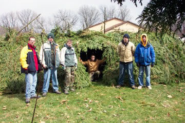 The scouts do a test run of a pine bough shelter that they built as part of a contest in the Spring Camporee.