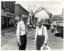 From our Historical Notebook this week we present a 1964 photo of two "old-timers" who recalled earlier construction projects in downtown Albion. On the left is pharmacist Floyd Parks (1890-1967) of Park’s Drug Store, speaking with (right) Hiram McCullough (1882-1969) about the days when Hiram was foreman of the street department and supervised WPA projects here. In the distance we see the equipment of the Titus Construction Company of Galesburg removing sidewalks and curbing.