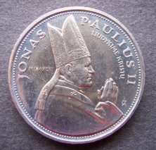 By Frank Passic, Numismatic Curator, Balzekas Museum Balzekas Lithuanian Museum Review, April-May-June 2005 (#210), pp. 12-13 With the death of Pope John Paul II on April 2, 2005, we are reminded about the one commemorative coin issued by the Lithuanian Mint honoring this extraordinary Pontiff. The year 1993 was an historic one for Lithuania. On June 25 the Lithuanian litas was restored as the official currency of the country, following 50 years of using an occupational monetary system. Coins and banknotes were issued bearing a Vytis emblem similar to that used before World War II. The new Lithuanian Mint had officially begun minting coins in October, 1992, with the minting of 1, 2, and 5 centas denominations. As time went on, the minting of other denominations were added as new equipment was installed. On July l6, 1993, the Bank of Lithuania issued its first modern commemorative coin. It was a 10 litu (KM-94) to commemorate the 60th anniversary of the tragic flight of Darius and Girenas. That coin was the first to feature the new modern-day version of the Vytis emblem, and was sculpted by the Mint’s designer, Petras Garska. Coins were packaged in a square clear plastic snap-type holder, with a green hard plastic insert to hold the coin. Just two months later, on September 2, 1993, the Bank issued its 2nd commemorative coin, with the same type of packaging. Again a 10 litu, this one bore the same obverse Vytis design on the obverse, but the reverse had a special theme. ![]() 1993 Pope John Paul II Commemorative 10 Litu Coin, obverse view