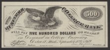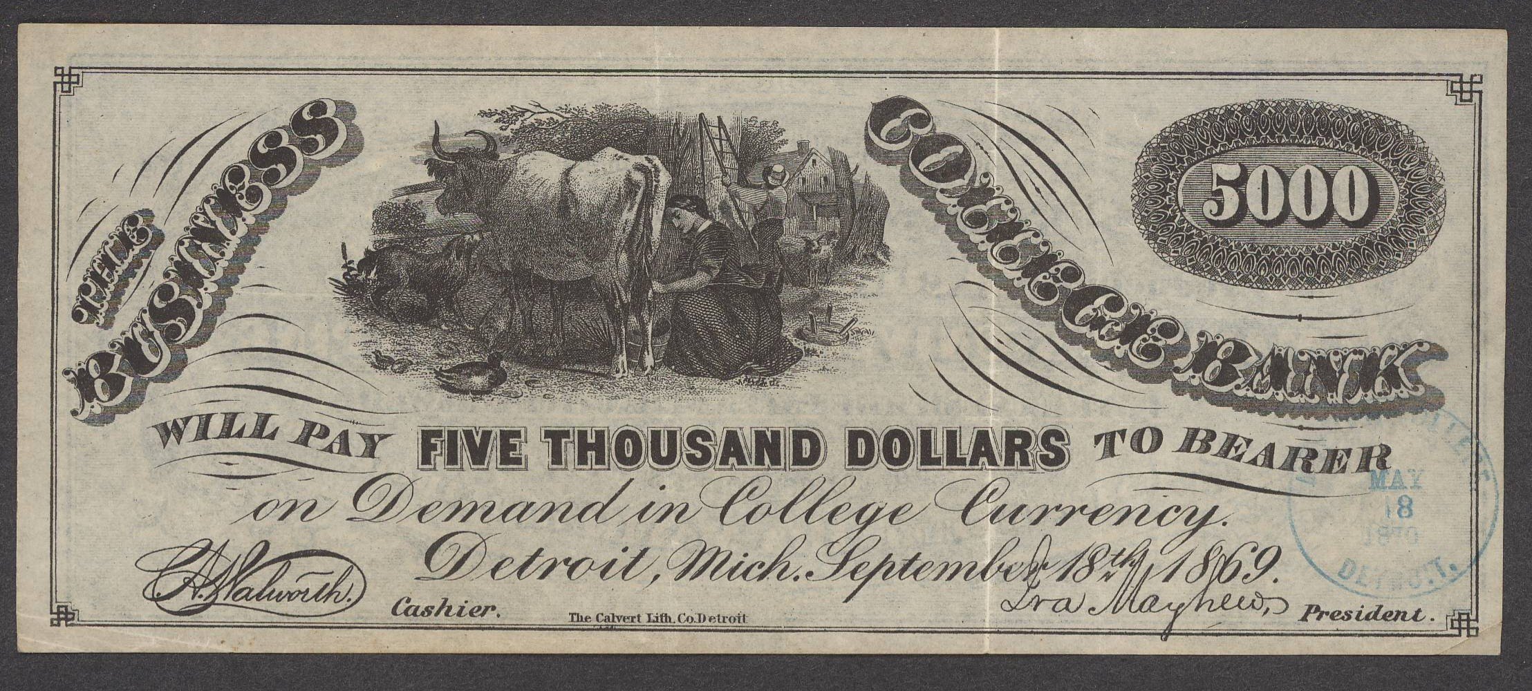 Thus these items were part of the Business College “kit” of E. Littebrant, used in the Commercial Department of Hillsdale College for the 1870-71 school year. The four notes in the kit were in remarkable (EF-AU) condition considering their age. Bearing a printed date of September 18, 1869, all measure approximately 186 x 77 mm. The 1869 date coincides with the first semester business class Ira Mayhew conducted in Detroit after his move from Albion. As stated on the face near the lower center margin, the notes were printed by “The Calvert Lith. Co. Detroit.” The lithograph signatures are those of (lower left) “C.A. Walworth, Cashier,” and (lower right) “Ira Mayhew, President.” Schingoethe catalogs these notes as MI-375, plus the denomination numeral. They have been assigned a rarity rating of R-7. The 5,000 dollar denomination note is especially rare.