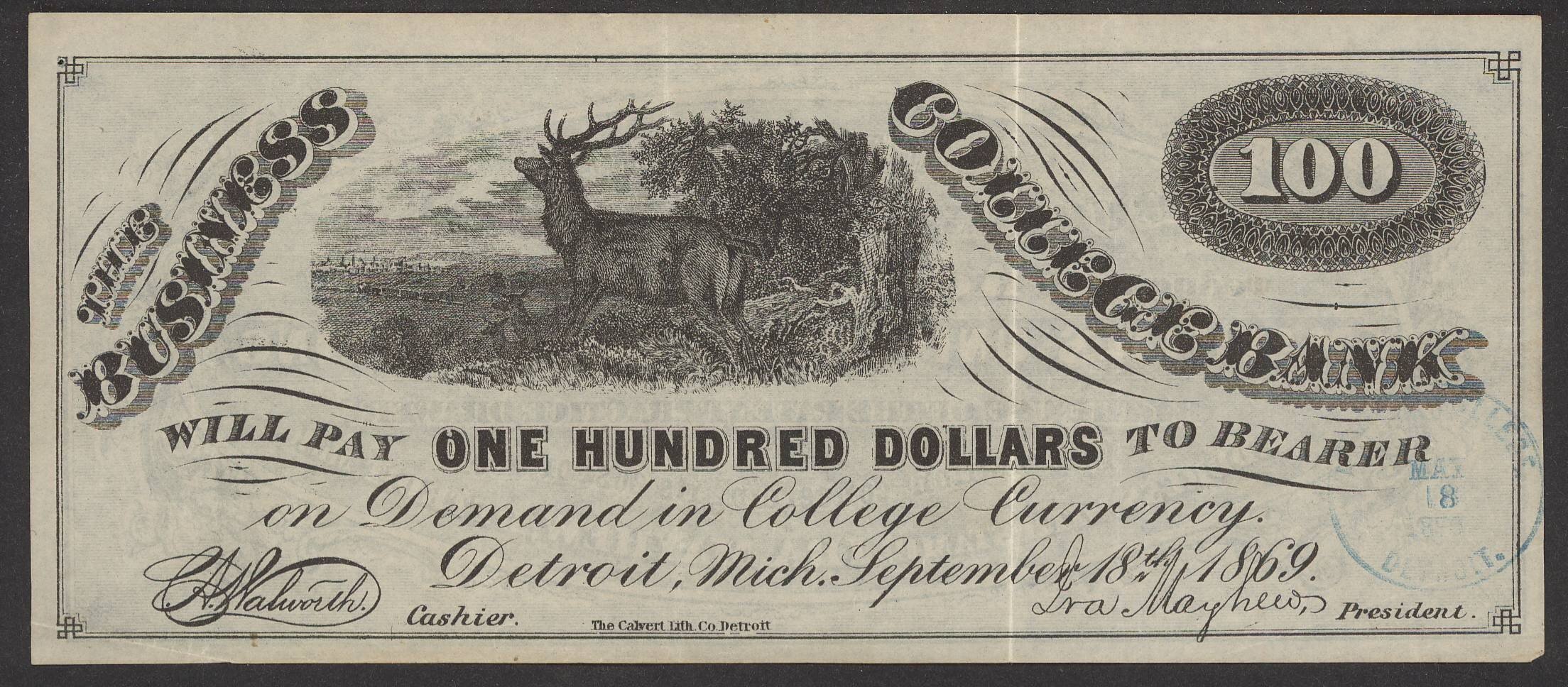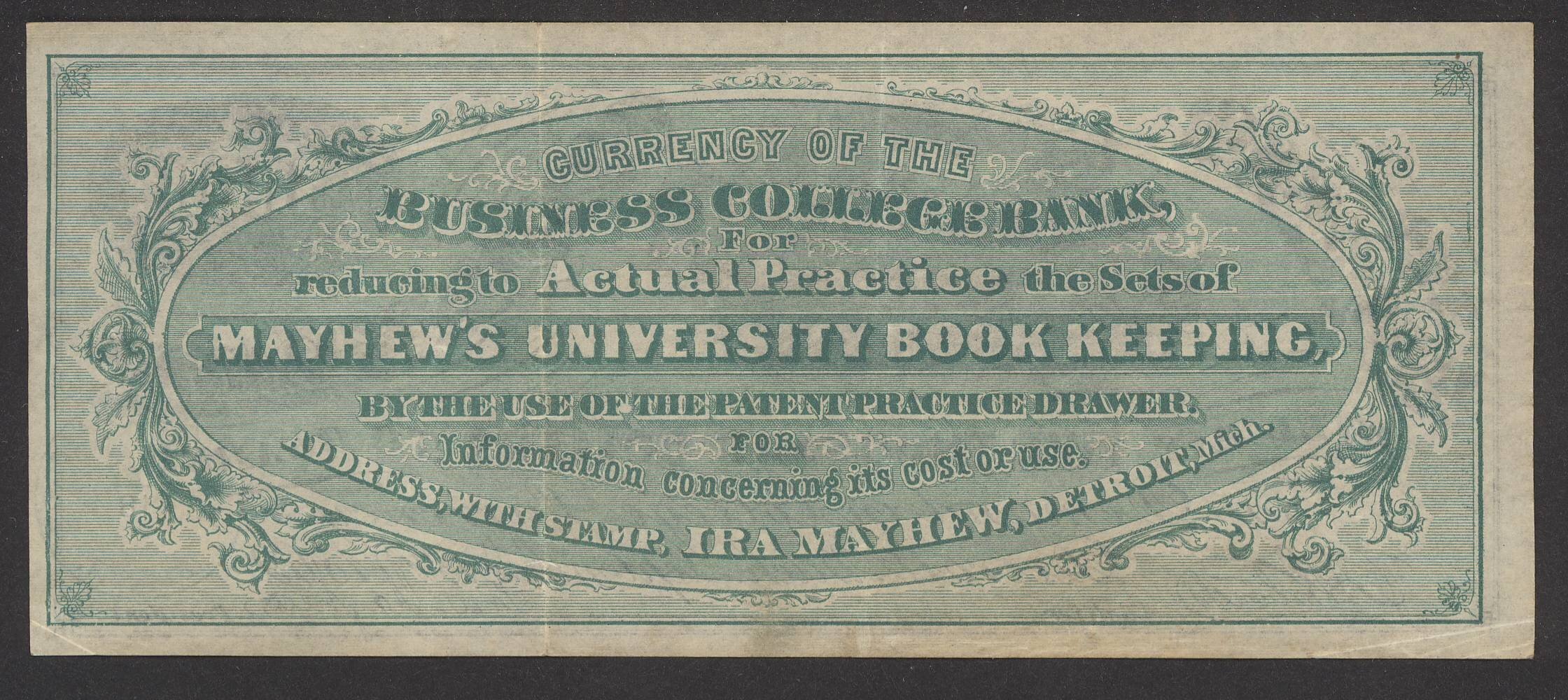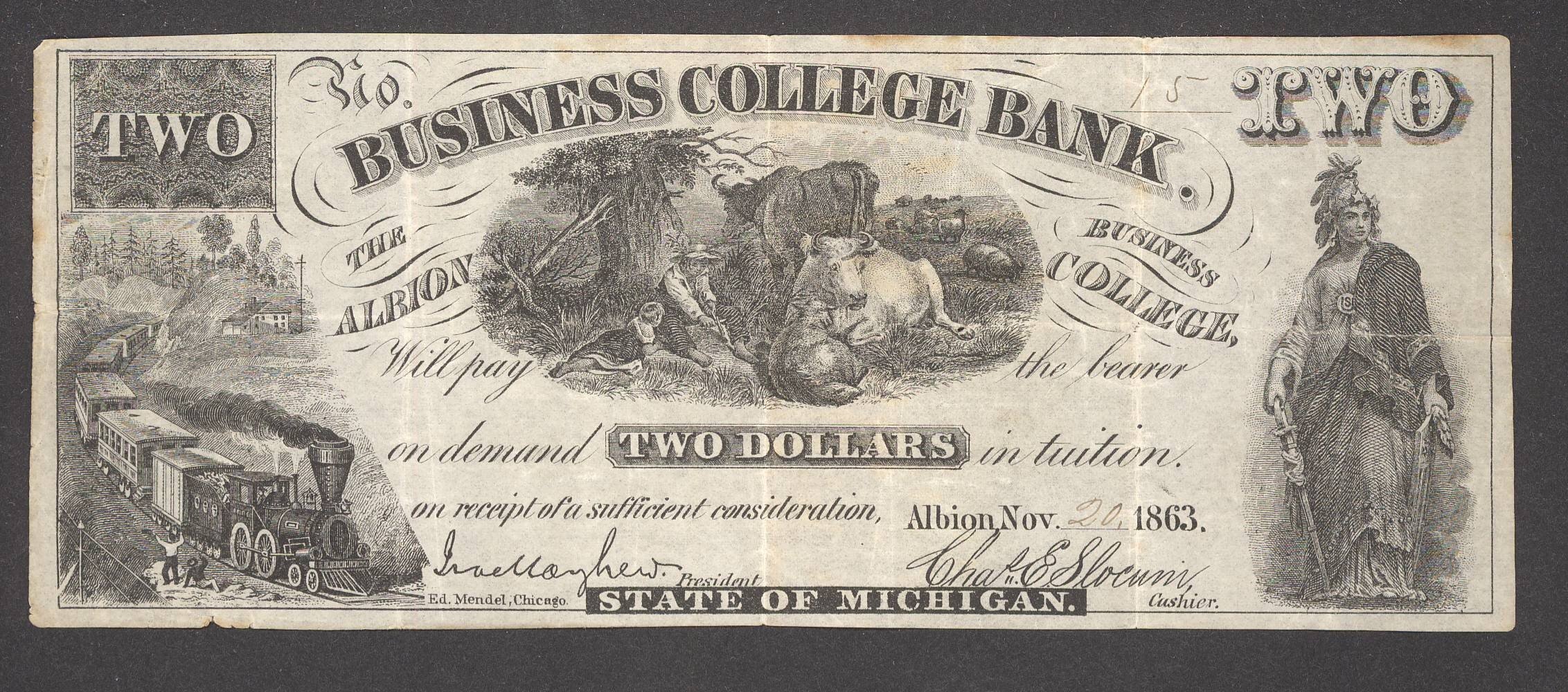 Ira Mayhew (1814-1894) was a well-known 19th century Michigan educator who authored several books, including “Mayhew’s Practical Book-Keeping.” His business school was founded in 1860 in Albion, and was first known as the “Albion Commercial College.” “College scrip” notes were issued in denominations of $1, $2, and $5, as well as a Civil War token during the school’s tenure in Albion. ![]() Two Dollar Bill