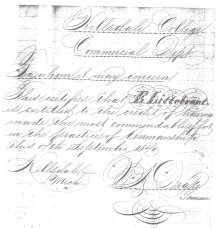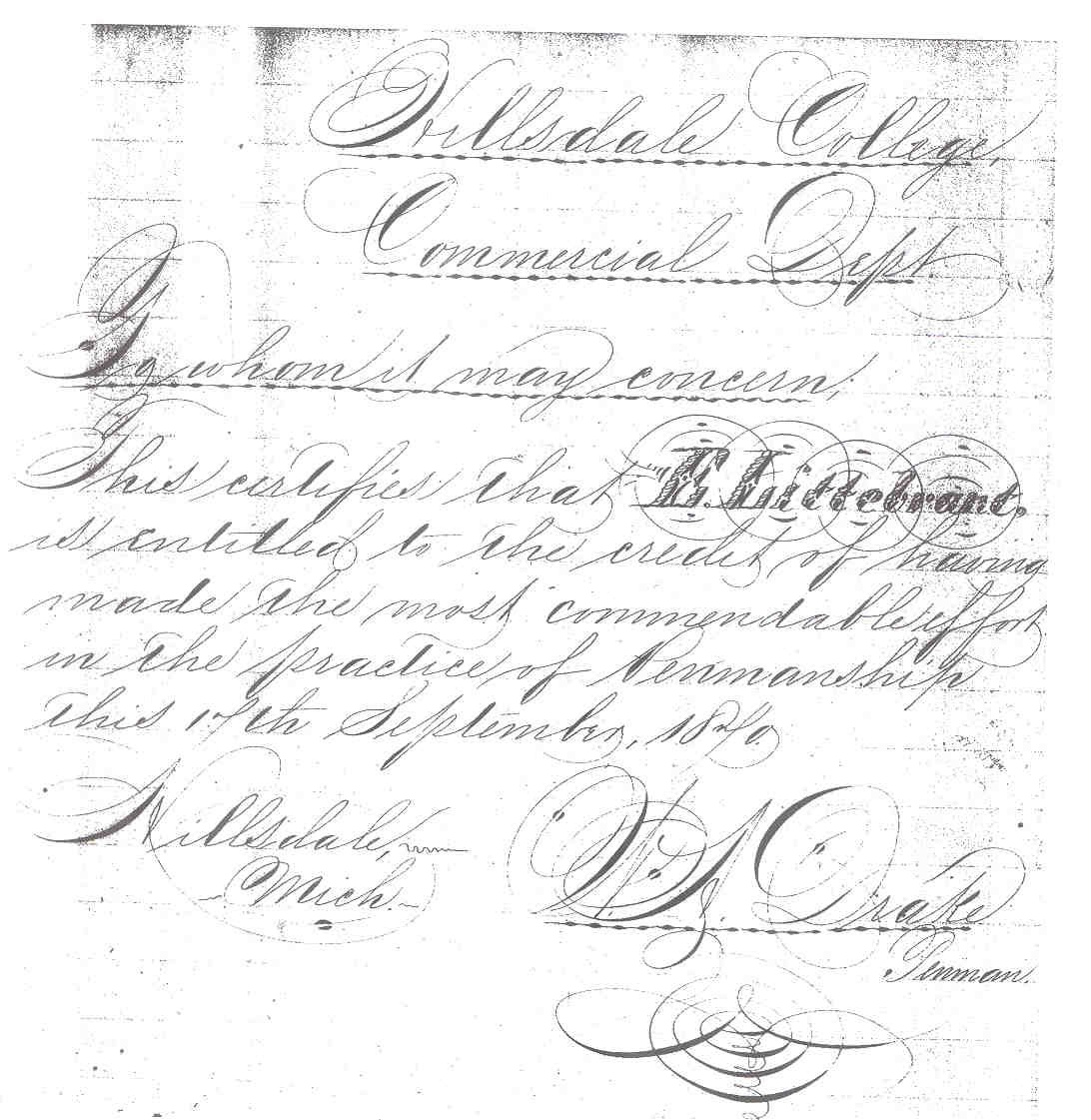 Upon leafing through the ledgers, this author discovered a certificate inserted in one of them which contained a handwritten text. It stated: “Hillsdale College. Commercial Dept. To whom it may concern: This is to certify that E. LITTEBRANT is entitled to the credit of having made the most commendable effort in the practice of penmanship this 17th day of September, 1870. Hillsdale, Mich. W. J. Drake, Penman.” ![]() Hillsdale College, Commercial Dept. Certification