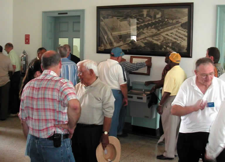 Many people were on hand as the photo was dedicated, and a plaque hung to commemorate all of the years of employment that Albion Malleable and Harvard Industries gave to Albion. In this scene, Tom Brown, (left back) Charles Snyder, (center) and Lee Winter (right) appreciate the chance to visit with old friends and co- workers.